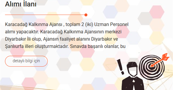 Karacadağ Kalkınma Ajansı, 4 Sayılı Cumhurbaşkanlığı Kararnamesi ile Kalkınma Ajansları Personel Yönetmeliği hükümleri çerçevesinde; Diyarbakır ve Şanlıurfa Bölgesinin kalkınması ve gelişmesine hizmet etmek isteyen, esnek ve dinamik çalışabilen, yaratıcı ve analitik düşünebilen, takım çalışmasına yatkın, İngilizceyi akıcı şekilde konuşabilen, kendine güvenen, iletişime açık, pozitif düşünen, üretken, değişen çalışma koşullarına kolay uyum sağlayabilen ve seyahat engeli olmayan 2 (iki) Uzman Personel alımı yapacaktır. Karacadağ Kalkınma Ajansının merkezi Diyarbakır İli olup, Ajansın faaliyet alanını Diyarbakır ve Şanlıurfa illeri oluşturmaktadır. Sınavda başarılı olan adaylar bu illerden, Ajans’ın uygun göreceği birinde çalışmayı kabul ve taahhüt ederler.